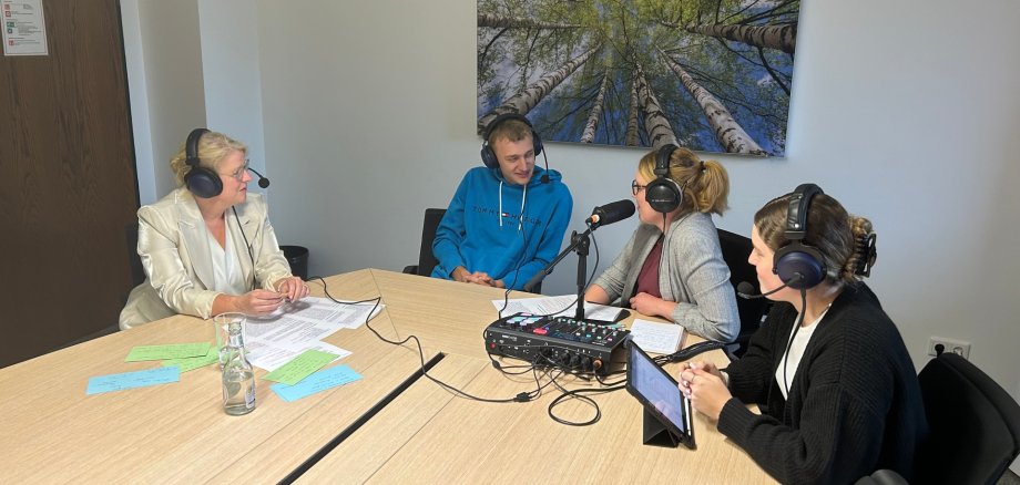 (Das Bild zeigt v.l. Ausbildungsleiterin Melanie Westerbeck, Hendrik Voß, Moderatorin Antonia Helling und Maja Perkovic)