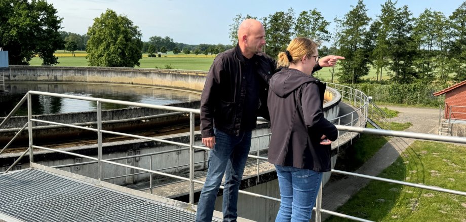(auf dem Bild: René Bushuven und Podcast-Host Antonia Helling beim Klärwerk-Rundgang)