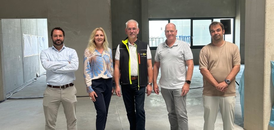 Damit ist der Neubau größer als der in unmittelbarer Nähe liegende Stammsitz des Unternehmens Sita. Bürgermeisterin Karin Rodeheger nutze die Gelegenheit, sich einen ersten Eindruck von der entstehenden Logistikhalle zu verschaffen und erkundete unter anderem den integrierten Bürokomplex.
