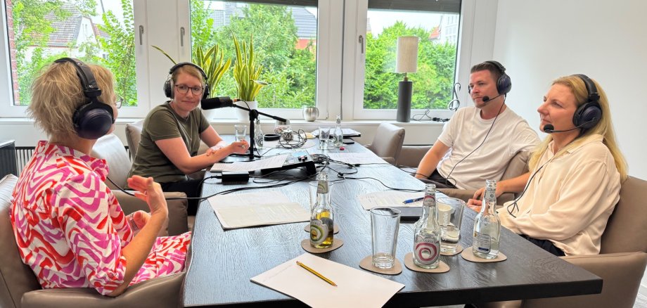 Das Foto zeigt v.l. Nicola Köstens vom Fachdienst Stadtentwicklung, Moderatorin Antonia Helling, Leonard Gromes von der Wirtschaftsförderung und Bürgermeisterin Karin Rodeheger.