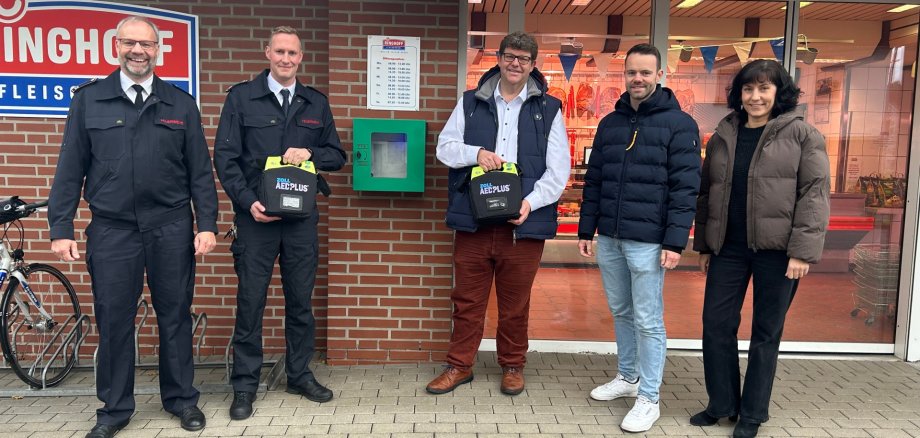 Das Foto zeigt v.l. Ludger Brüggershemke (ehm. Sachgebietsleiter Rettungsdienst), Dennis Vogel (Sachgebietsleiter Rettungsdienst), Niklas Ringhoff (Geschäftsführer Fleischerei Ringhoff), Christian Griesedieck (Stadt Oelde - Ordnungsamt), Annegret Beckemeyer (Stadt Oelde - Fördermittelmanagerin)