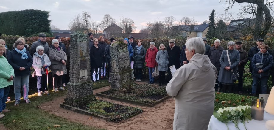 In Gedenken an die Reichspogromnacht fand die Gedenkfeier am Sonntag erstmals auf dem Jüdischen Friedhof am Wiedenbrücker Tor in Stromberg statt. Christiane Glitscher-Krüger, die Organisatorin, zeigte sich überwältigt von dem großen Interesse und der hohen Besucherzahl. Vor etwa siebzig Besucherinnen und Besuchern hielt Bürgermeisterin Karin Rodeheger eine Ansprache zu diesem dunklen Ereignis der deutschen Geschichte. Schülerinnen und Schüler der Gesamtschule Oelde trugen Berichte aus dem Buch der Oelder Autorin Christine Laumeier über das jüdische Leben in Stromberg vor. Im Anschluss wurden die Namen der jüdischen Gemeindemitglieder, die damals in Oelde und Stromberg lebten, nach Straßen verlesen. Die Klänge einer Klangschale verliehen der Verlesung eine besonders bewegende Atmosphäre. Nach einer Gedenkminute suchte die Besuchergruppe dann die Stolpersteine der Familien Loe und Silberberg auf, die in der Daudenstraße lebten.
