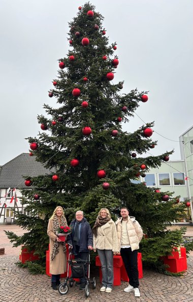 Der Spender erklärte, dass ohnehin eine Entscheidung getroffen werden musste, da die Sorge bestand, die Tanne könne einem starken Ostwind nicht mehr standhalten. Der 83-Jährige zeigte sich begeistert von den Mitarbeitenden des Bauhofes, die den Baum in der vergangenen Woche fachgerecht gefällt und zügig auf einen Container geladen hatten. „Man hat sofort gesehen, dass hier ein gut aufeinander eingespieltes Team im Einsatz war“, freute sich der Oelder und war sichtlich berührt als er seine Tanne so festlich geschmückt in Augenschein nehmen konnte.