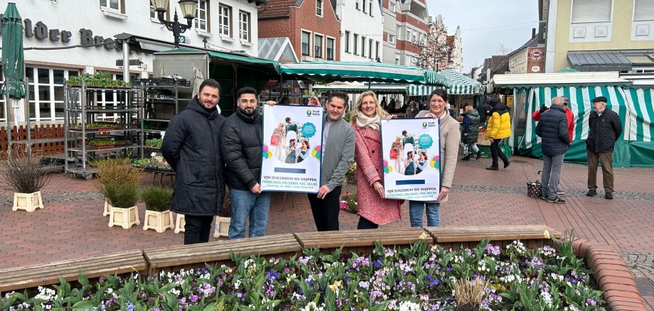 Das Foto zeigt v.l.: Panagiotis Konstantinou, Peschiwar Kanaan (beide Feuer und Eis), Stefan Vogelsberg (Modehaus Rusche), Bürgermeisterin Karin Rodeheger, Marijke Wiemann (Forum Oelde)