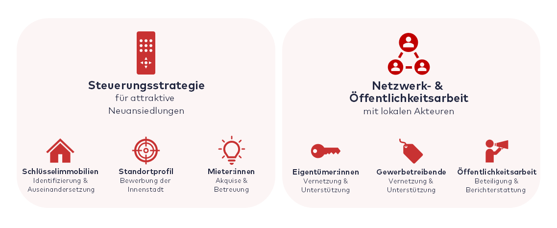 Im Kern bezeichnet das Ansiedlungsmanagement die strategische Gewinnung und Betreuung neuer Betriebe zur Stärkung der wirtschaftlichen Vielfalt und Attraktivität der Innenstadt.